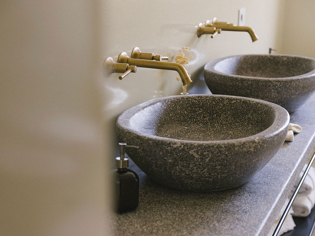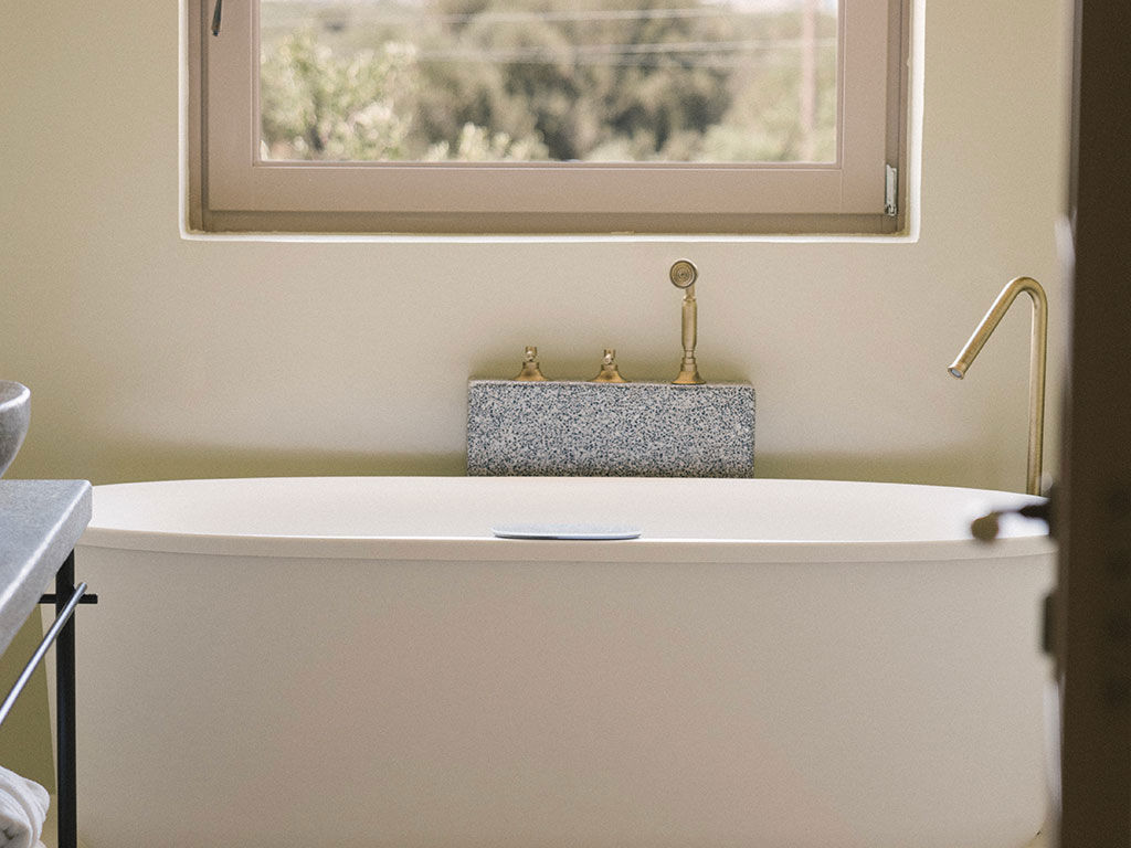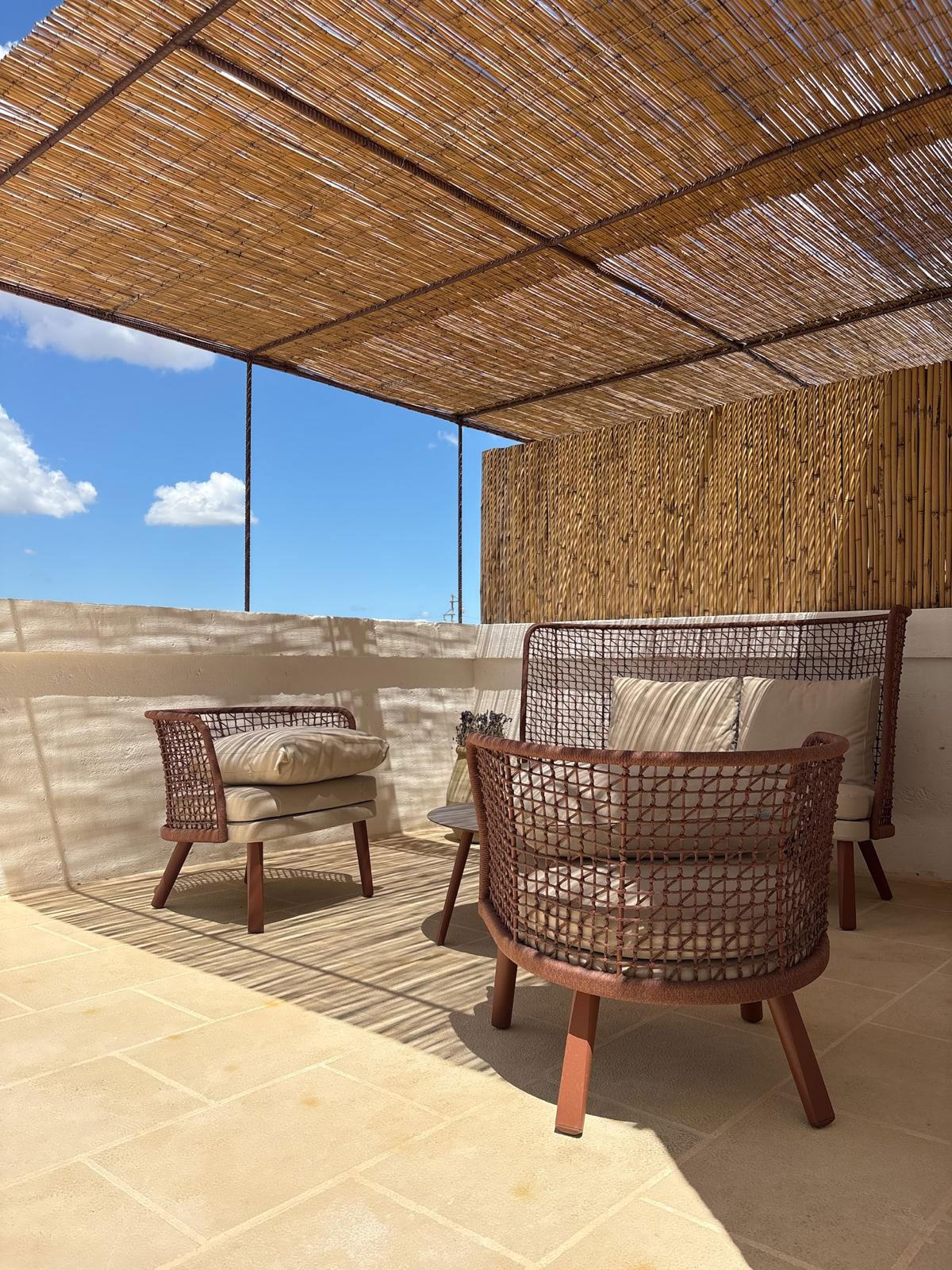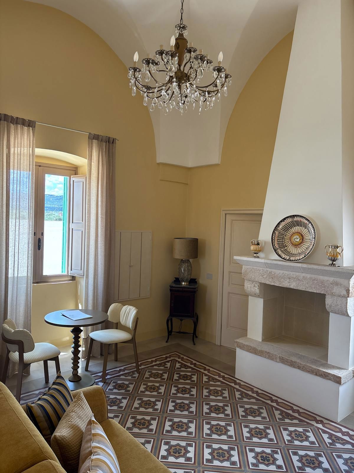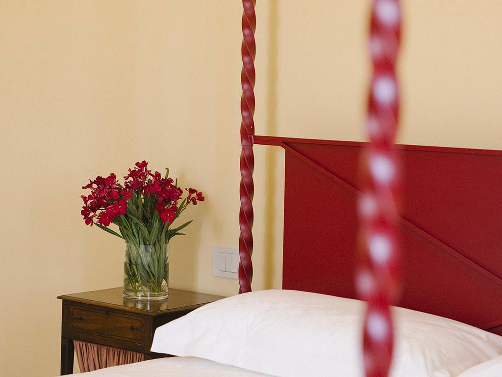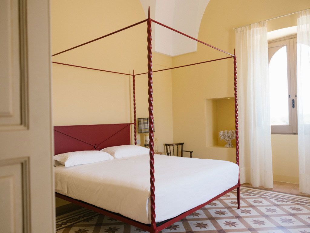 La suite, con i suoi 44 m² , esposta sui 3 lati della masseria, è composta da due ambienti separati. Una romantica camera matrimoniale, con ampie finestre, letto a baldacchino con materasso Simmons® e soggiorno con camino e divano letto.