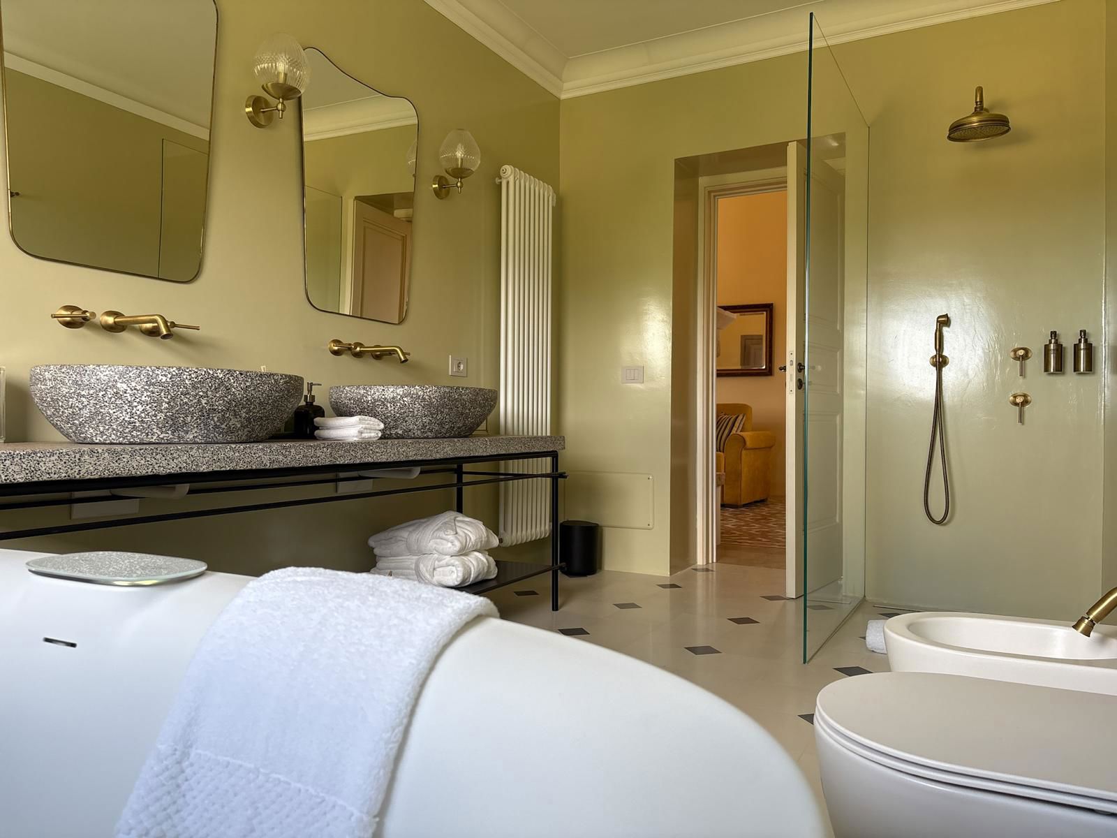 Bagno spazioso di 11 m² con ampia finestra, doppio lavabo, doccia e vasca idromassaggio Jacuzzi® tecnologia Swirlpool®.